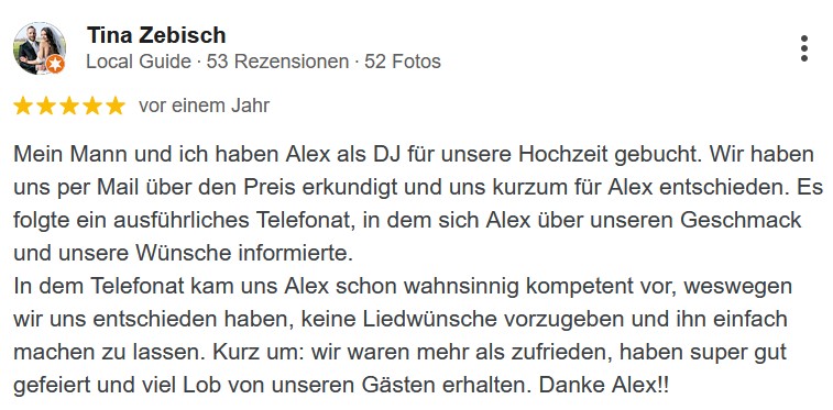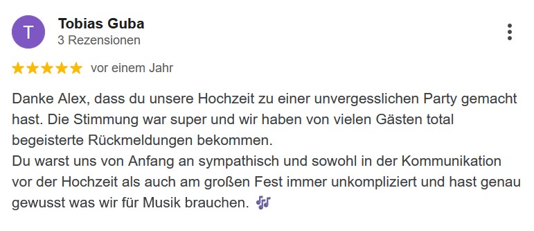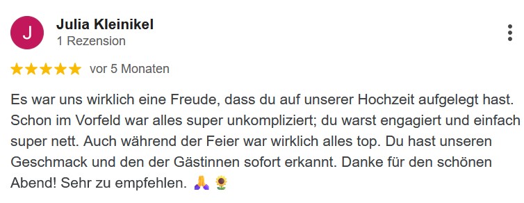 Musikwünsche bieten mir als eurem DJ die Gelegenheit den Musikgeschmack eurer Hochzeitsgesellschaft noch besser treffen zu können und wirklich alle Gäste abzuholen. Deshalb erfülle ich sehr gerne eine überschaubare Menge an Musikwünschen.